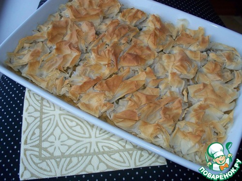 Этот рецептик я нашла в журнале "Вкусно и полезно" за 2011 год. Очень вкусная и полезная, не перегруженная продуктами получилась запеканочка. Тесто фило в этом рецепте выполняет роль воздушного и легкого покрывала. Предлагаю рецептик, может быть, еще кому-то он придется по вкусу.