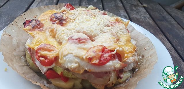 Пока пекутся овощи, берём мясо. Лучше если оно будет заранее сварено. Я брала куриный шницель в панировке, просто потому что, его никто гне хотел доедать, а выбрасывать было жалко такую вкусноту:) Можно любое мясо, я думаю. Нужно, чтобы его было больше, чем овощей. Мелко нарезаем, тоже перемешиваем со сметаной и приправой. Выкладываем третьим слоем. Припекаем.