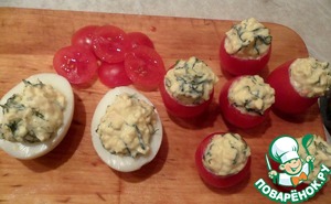 Начиняем ею помидорки и белок.