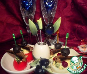 На шпажку сажаем рыбку и маслину, втыкаем в помидорку и яйцо. Наша закуска готова!