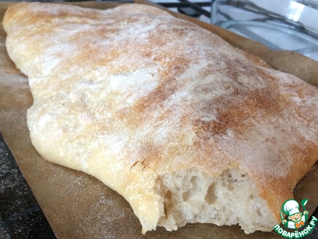 Камень для выпечки положить на решетку в верхней трети духовки. Духовку разогреть с камнем в течение 30 минут до 230 С. Заготовку аккуратно перенести на перевернутый противень, покрытый пекарской бумагой. Скинуть заготовку вместе с бумагой на камень. Выпекать чиабатту 15-20 минут до золотистой корочки, первые 10 минут с паром (в емкость на дне духовки налить 50 г. теплой воды). Повторить для каждой заготовки.