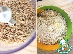 Для начала нужно смолоть орехи. Не до состояния муки, чтобы оставались кусочки. А чтобы орехи не превратились в пасту, к ним мы добавим сахар, желательно крупный.
