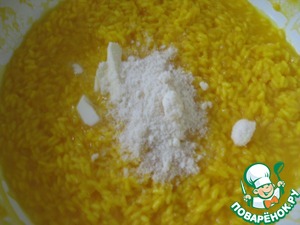 В одном половнике горячего бульона развести шафран, добавить к рису. Готовить рис 14 минут до состояния аль денте, посолить. -