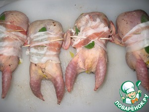 На грудку каждой перепелки положить по листику шалфея, обернуть беконом, закрепить бекон зубочисткой.