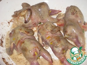 На широкой сковороде с толстым дном (широкая, чтобы влезли все перепелки в один слой) разогреть 2 ст. ложки сливочного масла, обжарить перепелок до золотистого цвета.