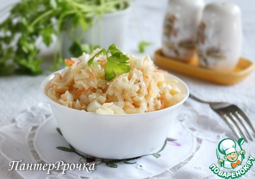 Очень интересный и полезный салат, т. к. содержит эликсир молодости - квашеную капусту. Пикантный вкус капусты дополняют чуть острый сыр и яйца.