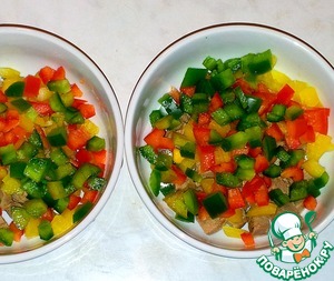 Филе утки нарезать на небольшие кусочки и выложить в креманки. От каждого перца взять 1/4 часть и нарезать кубиками.