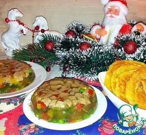 Вкусное и яркое заливное украсит новогодний стол.