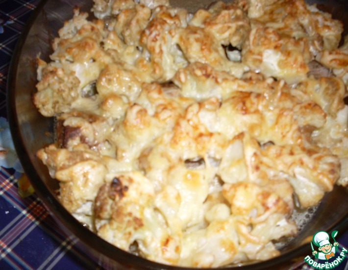 по этому рецепту можно приготовить просто цветную капусту без мяса. А можно к капусте добавить дольки отварного картофеля и также поместить в соус и запекать под сыром минут 15. Тоже вкусно!