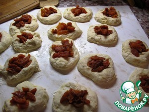 Теста получается 1100 грамм. Я разделила на 25 частей. На кусочек теста выкладываем курагу и защипываем в виде "торбочки" -