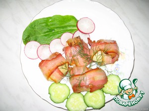 • Отварной картофель крест-накрест обматываем беконом и выпекаем в духовке 10 минут на 220 градусах.