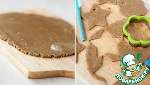 4. Разогрейте духовку до 180 С. Достаньте тесто из холодильника, раскатайте на присыпанной мукой поверхности в пласт толщиной 5-6 мм. Вырежьте печенье формочкой, дырочку можно сделать с помощью трубочки для коктейля. Выложите печенье на противень, застеленный бумагой для выпечки.