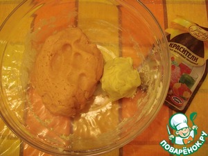 Растереть размягченный маргарин с яйцом и сахаром. Добавить остальные ингредиенты и замесить пластичное тесто. Отделить от него примерно пятую часть и отложить. В бОльшую часть теста добавить пищевой краситель до получения розового цвета.