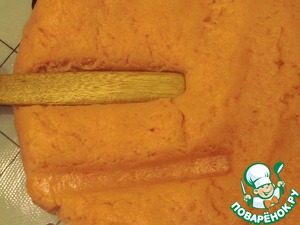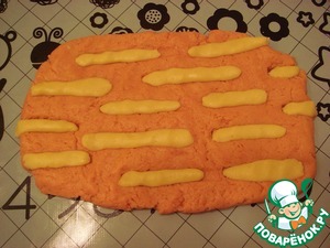 Черенком деревянной ложки или другим подручным инструментом проделать в розовом тесте канавки – в произвольном порядке.