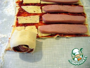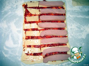 тесто смазать томатной смесью,уложить рядочками сыр, на него сосиски