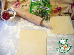 разморозить тесто, раскатать вдоль (толщиной около 0,3см)