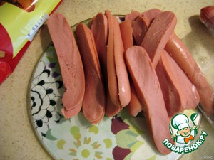 сосиски порезать вдоль на 4 полосочки, сыр тонко нарезать полосочками шириной как сосиски