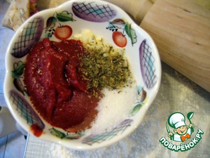 чеснок измельчить смешать с томатной пастой, специями, сахаром