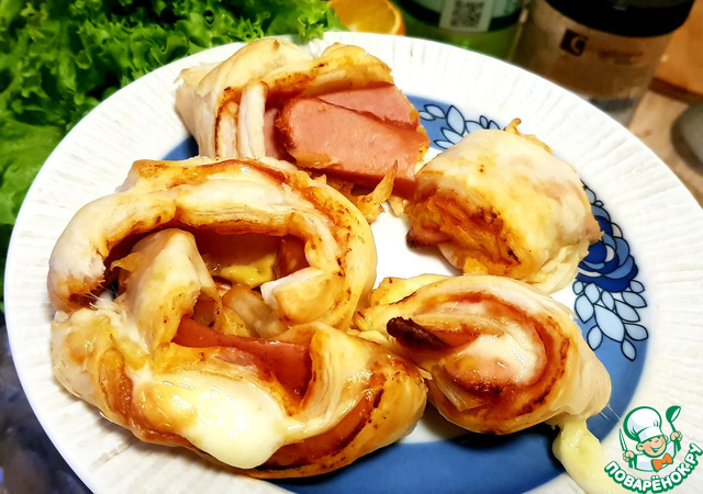 Очень нежные воздушные спиральки из слоеного теста с сыром, сосиской, пряностями, чесночком и томатной пастой.. очень быстро готовятся и быстро съедаются с пивом, да в хорошей компании..