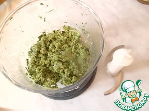 Измельчить в блендере листья базилика, 70 гр сыра, чеснок, 1 ст. л. растительного масла.
