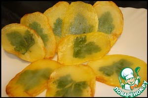Снимаем на салфеточку. В процессе жарки чипсы вздуются, т. к. масло будет попадать между слоями. Чтобы это исправить, как только мы сняли чипс со сковороды, нужно придавить серединку, чтобы картофель хорошо пристал к петрушке и друг к дружке. -