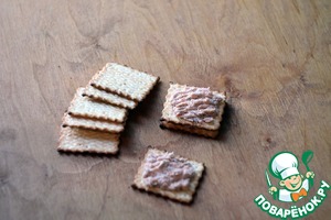 Для второго варианта - на один крекер положить рыбную начинку, накрыть вторым и снова сверху выложить немного начинки.