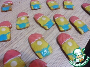Красной (у меня не очень насыщенная вышла) глазурью рисуем колпачки, синей - комбинезончики, остатками белой глазури - глазики и "мех" с бубончиками на шапочках.