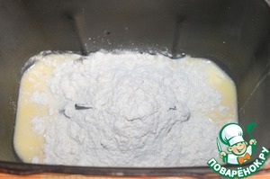 Теперь заводим тесто. Смешать молоко, масло, яйцо, муку и дрожжи