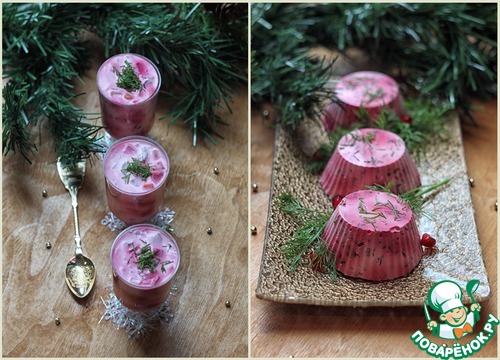 Эта закуска чем-то напоминает всем известную селедку под шубой, но все же она другая, да и порционная подача делает ее очень привлекательной. Нам понравилась. Готовится легко, а выглядит очень нарядно. Всех приглашаю на дегустацию. За идею рецепта спасибо Фиалке.