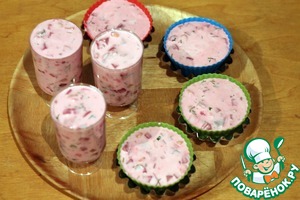 Я решила подавать эту закуску двумя способами: используя силиконовые формочки для кексов и небольшие стаканчики. Их нужно заполнить и убрать в холодильник до полного застывания (у меня они стояли ночь).