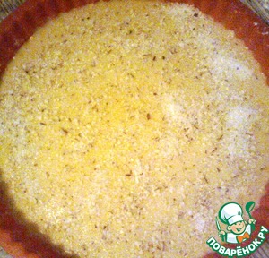 Орехи измельчаем (например, на терке), смешиваем с 0,5 стаканом сахара. Хочу заметить, у меня здесь начинки ОЧЕНЬ мало, делала не по рецепту (орехи все на пахлаву ушли). Чем больше начинки, тем вкуснее этот пирог!