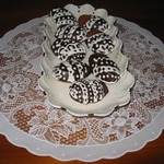 Помещаю глазурь в кондитерский мешок с насадкой с очень маленьким круглым отверстием (если в кондитерский мешок Вы помещаете не всю глазурь, то обязательно переложите ее в полиэтиленовый мешок, т. к. она быстро засыхает). А теперь - "урок рисования" - рисую кружевные узоры, можно и новогодние узоры нарисовать, например, снежинки. Это первый вариант рисунка на моем печенье.