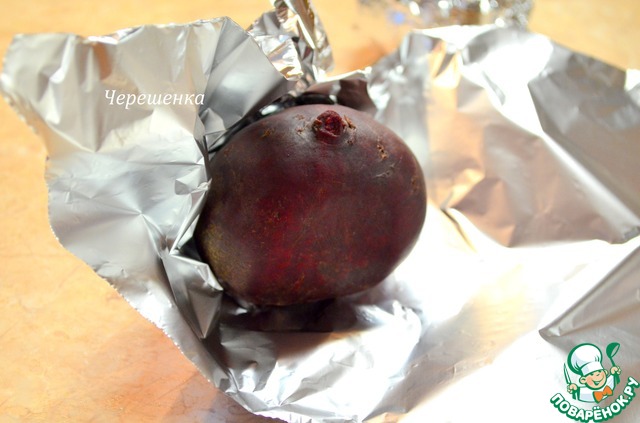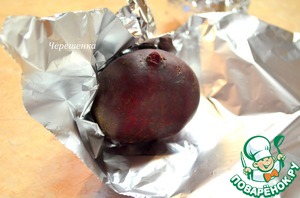 • Свеклу промыть, завернуть каждую в фольгу и запекать в духовке при 200 градусах 40-50 минут. Готовность проверить шпажкой, которая должна свободно проколоть овощ.