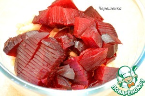• Свеклу обдать холодной водой, почистить и порезать тонкими пластинками.