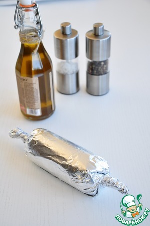 С помощью фольги скрутить рулет так, чтобы каннелони была внутри посередине. Плотно свернуть фольгу с фаршем в виде конфеты. Запекать при 180* 25-35 минут в зависимости от размера.