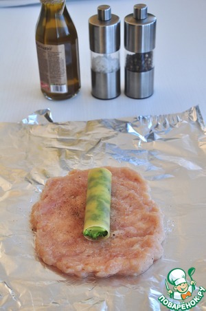 Сложить фольгу в несколько слоев, глянцевой стороной вверх, смазать оливковым маслом. Разложить на поверхности фольги куриный фарш, посередине выложить фаршированный овощами каннелони.