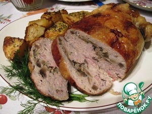 На шкурку выкладываем куриный фарш, посыпаем сушеными прованскими травами (базилик, розмарин, майоран), сверху слой грибов и снова фарш. Фаршем набиваем "окорочка".
