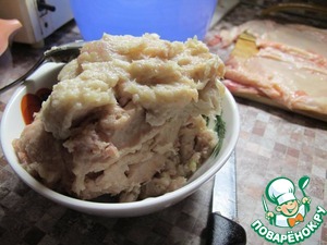 К фаршу добавляем сливки, майонез, белый хлеб, молотый белый перец, тертый мускатный орех, соль. Хорошо перемешиваем фарш и убираем на время в холодильник.