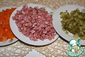 Колбасу, огурцы и морковь нарезать небольшими кубиками.