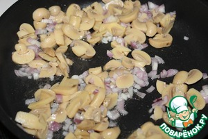 На сковороде с разогретым подсолнечным маслом обжарить грибы и мелко нарезанный лук-шалот до легкого подрумянивания грибов, 7 - 10 минут, дать остыть.