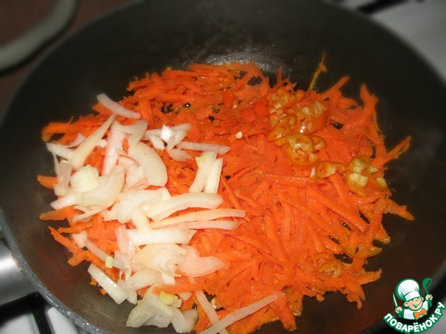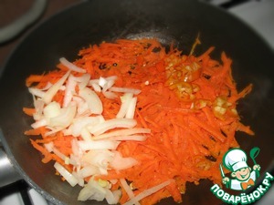 • Обжарить лук с морковью до светло-золотистого цвета.