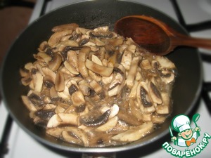 • Мясо тоже немного обжарить и смешать с зажаркой и грибами. Посолить по вкусу. Добавить измельченный чеснок и Чили.