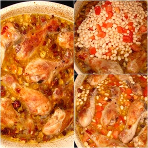 Пока курица запекается, нарезать помидоры кубиками и смешать с отваренной фасолью. -