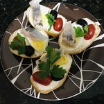 На тост намазываем творожный сыр (совсем чуть-чуть). Далее укладываем селедку, затем помидор, потом яйцо, маслинку и клюкву. Украшаем зеленью.