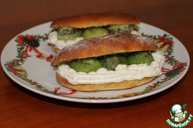 Укладываю три "горошины" из киви. С помощью шприца наношу крем по краю "горошин". Булочки готовы! Приятного Вам аппетита!