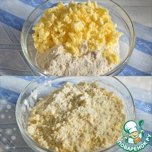 Холодное масло порежьте кусочками и смешайте с мукой до состояния крошек.