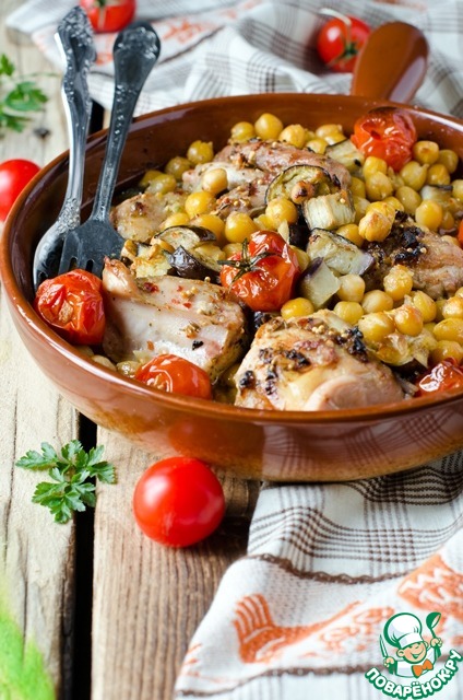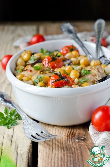 Тушить овощи с нутом на оливковом масле в течение 10 минут. Выложить их к мясу и запекать еще 5 минут.