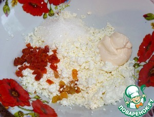 В творог добавить сахар, распаренные изюм и курагу, нарезанную мелко, и добавить йогурт. Массу тщательно перемешать.