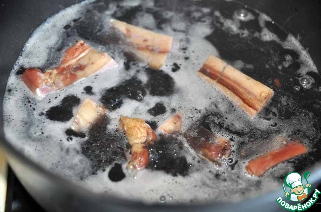 С замоченной фасоли сливаем воду, добавляем нарезанные рёбра, около 1 л воды и ставим вариться на 1 час.