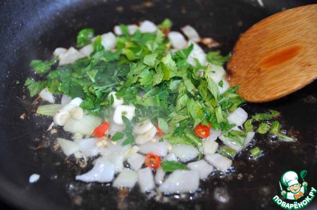 Добавляем нарезанный зубчик чеснока, мелко нарезанный красный жгучий перец (по вкусу), пол-пучка нарезанной петрушки, 1/2 чайной ложки сладкой паприки.